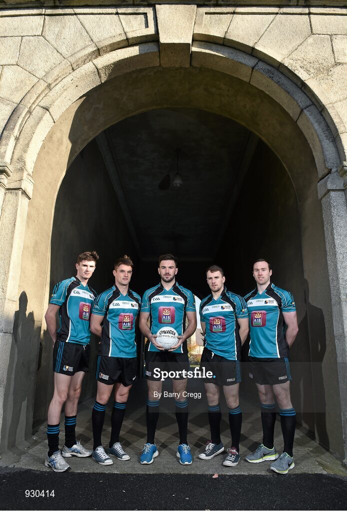 4 November 2014; Today Maynooth University GAA club launched its brand new team kit for their football, hurling, camogie and ladies football teams. In attendence are from left are Kildare footballer David Hyland, Dublin footballer Eric Lowndes, Kildare footballer Fergal Conway, Westmeath footballer Jamie Gonoud and Cavan footballer Fergal Flanagan during the Maynooth University GAA Club Kit Launch. Maynooth University GAA Club Kit Launch 2014/2015, North Campus, Maynooth University. Picture credit: Barry Cregg / SPORTSFILE