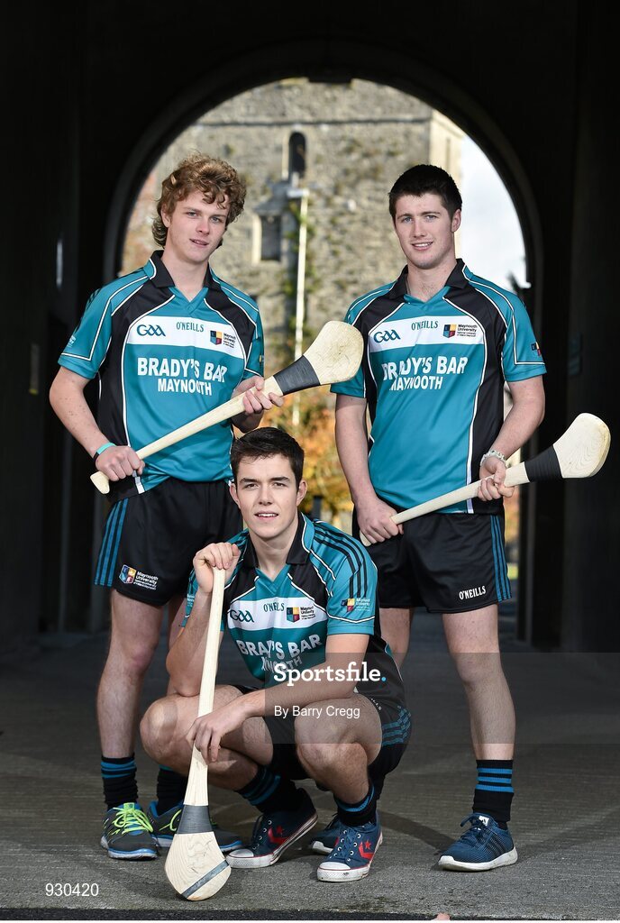 4 November 2014; Today Maynooth University GAA club launched its brand new team kit for their football, hurling, camogie and ladies football teams. In attendence are from left are Galway hurler Brian Molloy, Paddy Deegan and Galway hurler Éanna Burke during the Maynooth University GAA Club Kit Launch. Maynooth University GAA Club Kit Launch 2014/2015, North Campus, Maynooth University. Picture credit: Barry Cregg / SPORTSFILE