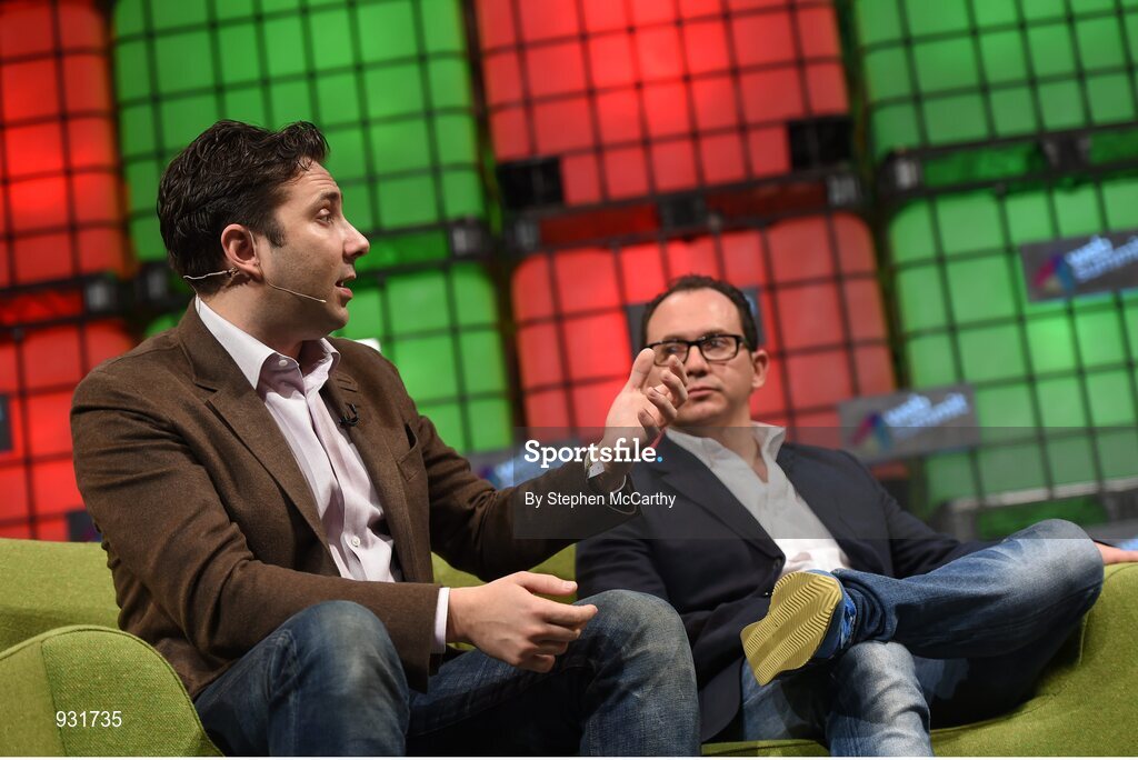 6 November 2014; Jay Bregman, left, Founder, Hailo, Christian Sanz, CEO, Skycatch, on the centre stage during Day 3 of the 2014 Web Summit in the RDS, Dublin, Ireland. Picture credit: Stephen McCarthy / SPORTSFILE / Web Summit