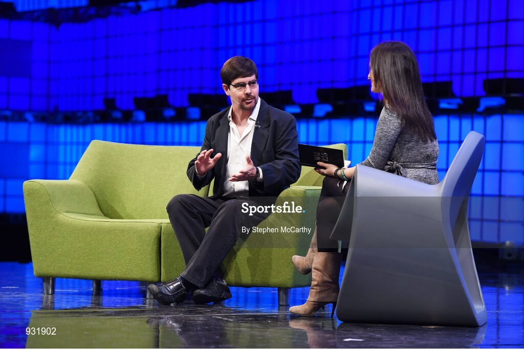 6 November 2014; Gavin Andresen, Chief Scientist, Bitcoin Foundation, in Conversation with Lisa Fleisher, Reporter, The Wall Street Journal, on the centre stage during Day 3 of the 2014 Web Summit in the RDS, Dublin, Ireland. Picture credit: Stephen McCarthy / SPORTSFILE / Web Summit