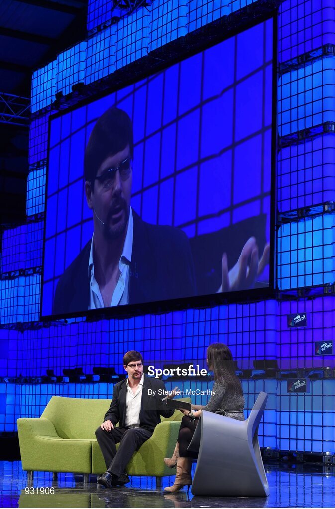 6 November 2014; Gavin Andresen, Chief Scientist, Bitcoin Foundation, in Conversation with Lisa Fleisher, Reporter, The Wall Street Journal, on the centre stage during Day 3 of the 2014 Web Summit in the RDS, Dublin, Ireland. Picture credit: Stephen McCarthy / SPORTSFILE / Web Summit
