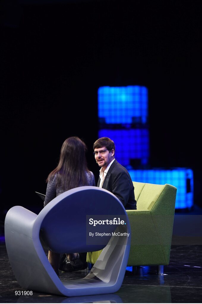 6 November 2014; Gavin Andresen, Chief Scientist, Bitcoin Foundation, in Conversation with Lisa Fleisher, Reporter, The Wall Street Journal, on the centre stage during Day 3 of the 2014 Web Summit in the RDS, Dublin, Ireland. Picture credit: Stephen McCarthy / SPORTSFILE / Web Summit