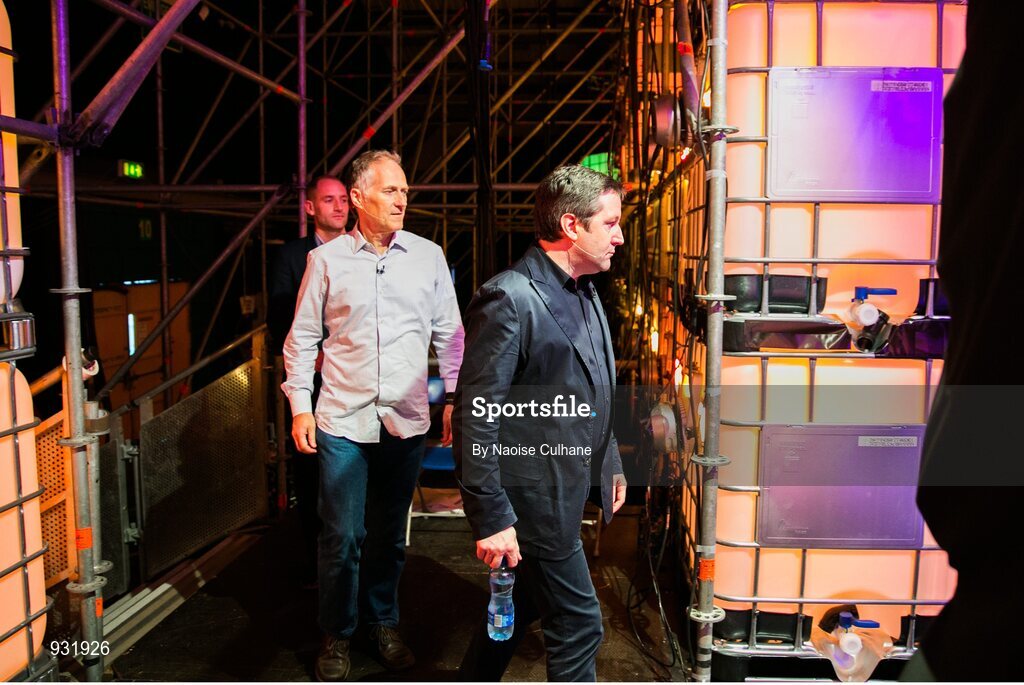 6 November 2014; Liam Casey, Founder, PCH, walks onto the centre stage with Tim O'Reilly, Founder & CEO, O'Reilly Media, in Conversation and Tom Cheshire, Technology Correspondent, Sky News, during Day 3 of the 2014 Web Summit in the RDS, Dublin, Ireland. Picture credit: Naoise Culhane / SPORTSFILE / Web Summit