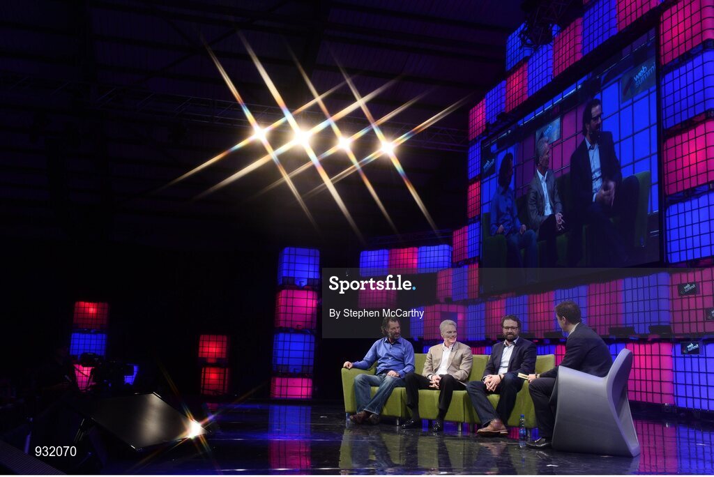 6 November 2014; Dan Levin, COO, Box; Mikkel Svane, Founder & CEO, Zendesk; and Brad Smith, CEO, Intuit, discuss The Evolution of Enterprise with Bruce Upbin, Managing Editor, Forbes, on the centre stage during Day 3 of the 2014 Web Summit in the RDS, Dublin, Ireland. Picture credit: Stephen McCarthy/ SPORTSFILE / Web Summit