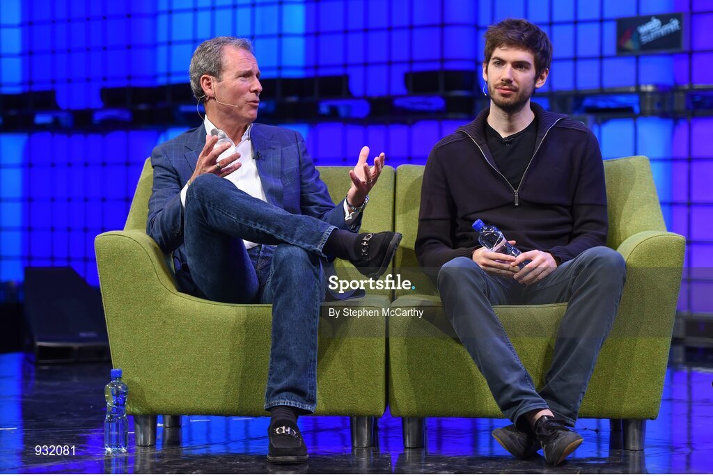 6 November 2014; John Hayes, left, CMO, American Express, David Karp, Founder & CEO, Tumblr, on the centre stage during Day 3 of the 2014 Web Summit in the RDS, Dublin, Ireland. Picture credit: Stephen McCarthy / SPORTSFILE / Web Summit