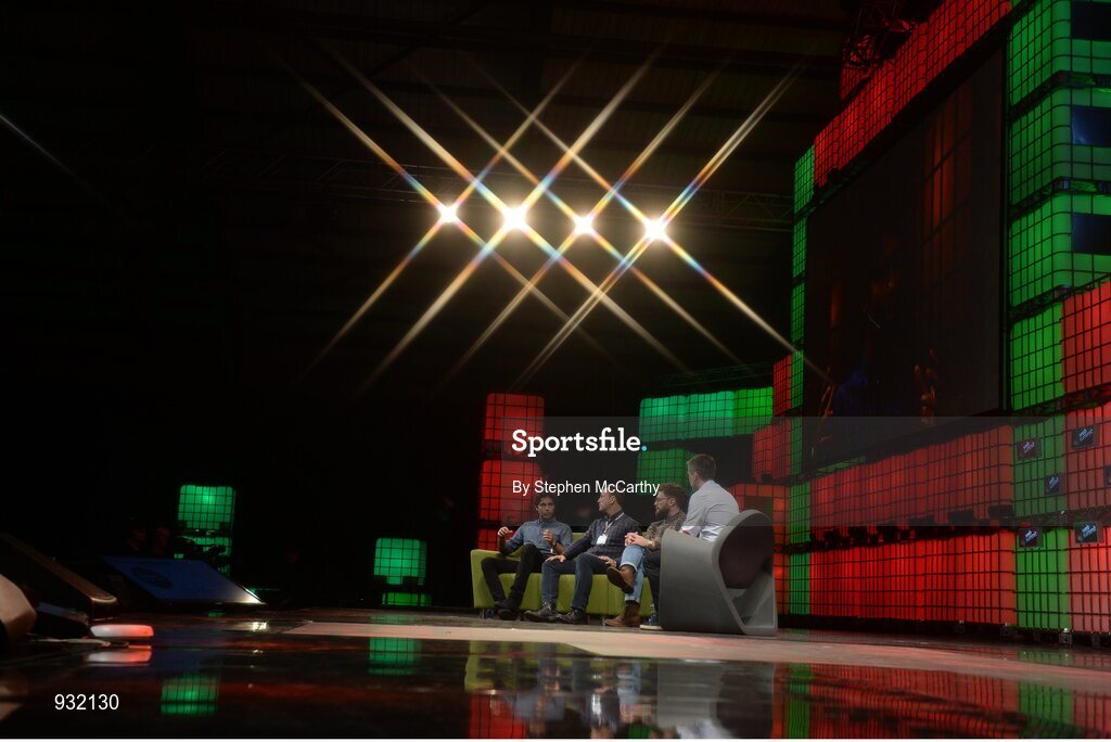 6 November 2014; Adrian Grenier, Founder, SHFT.com & Wreckroom Records; Jimmy Chamberlin, Founding Member and CEO/Co-Founder, Smashing Pumpkins and LiveOne Inc; and Chris Kaskie, President, Pitchfork, discuss Music in a Digital Age with Brian Morrissey, President & Editor-in-Chief, Digiday, on the centre stage during Day 3 of the 2014 Web Summit in the RDS, Dublin, Ireland. Picture credit: Stephen McCarthy / SPORTSFILE / Web Summit