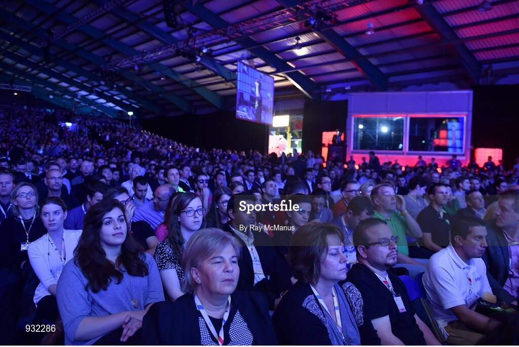 6 November 2014; Delegates listen to one of the speakers on the centre stage during Day 3 of the 2014 Web Summit in the RDS, Dublin, Ireland. Picture credit: Ray McManus / SPORTSFILE / Web Summit