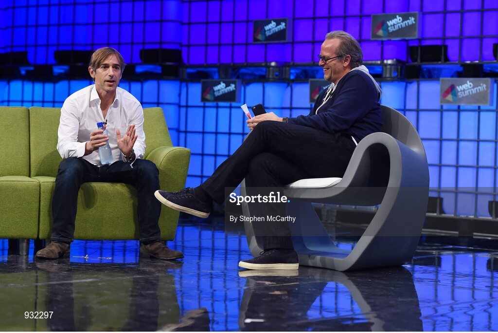 6 November 2014; Mark Pincus, Founder, Zynga, in Conversation with Tony Conrad, Founding Partner, True Ventures, about For the Love of the Game on the centre stage during Day 3 of the 2014 Web Summit in the RDS, Dublin, Ireland. Picture credit: Stephen McCarthy / SPORTSFILE / Web Summit