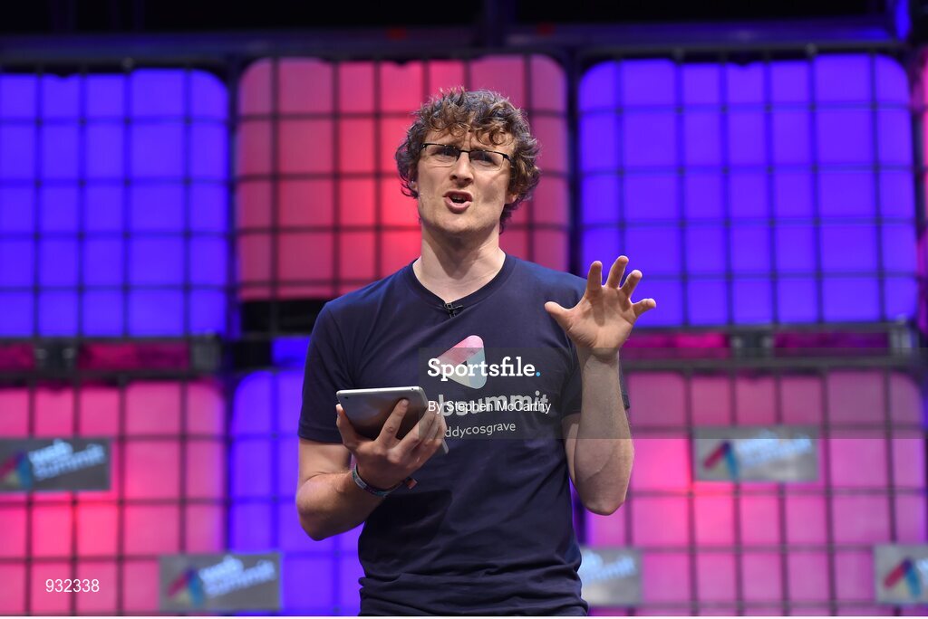 6 November 2014; Paddy Cosgrave, Founder and CEO, Web Summit, introduces Bono, Musician, Elevation Partners, to the centre stage during Day 3 of the 2014 Web Summit in the RDS, Dublin, Ireland. Picture credit: Stephen McCarthy / SPORTSFILE / Web Summit