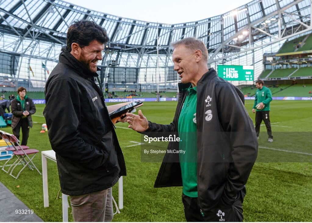 8 November 2014; Ireland head coach Joe Schmidt talks with former Ireland player Shane Horgan ahead of the game. Guinness Series, Ireland v South Africa, Aviva Stadium, Lansdowne Road, Dublin. Picture credit: Stephen McCarthy / SPORTSFILE