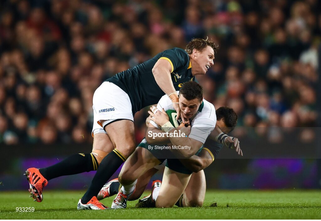 8 November 2014; Robbie Henshaw, Ireland, is tackled by Jean de Villiers, left, and Jan Serfontein, South Africa. Guinness Series, Ireland v South Africa, Aviva Stadium, Lansdowne Road, Dublin. Picture credit: Stephen McCarthy / SPORTSFILE