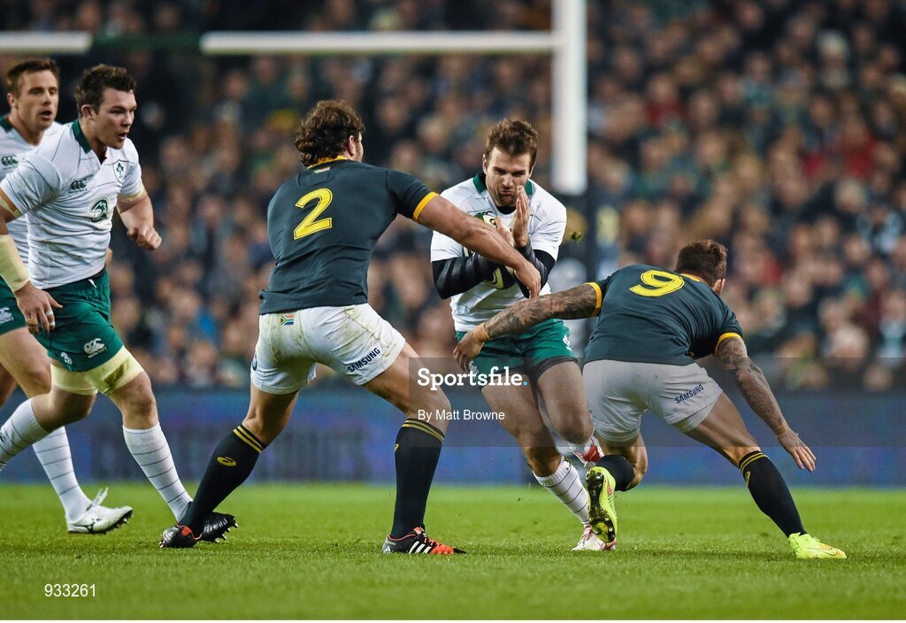 8 November 2014; Jared Payne, Ireland, is tackled by Bismarck du Plessis, left, and Francois Hougaard, South Africa. Guinness Series, Ireland v South Africa, Aviva Stadium, Lansdowne Road, Dublin. Picture credit: Matt Browne / SPORTSFILE