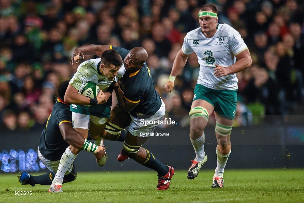 8 November 2014; Conor Murray, Ireland, is tackled by Tebo Mohoje, left, and Tendai Mtawarira, South Africa. Guinness Series, Ireland v South Africa, Aviva Stadium, Lansdowne Road, Dublin. Picture credit: Matt Browne / SPORTSFILE