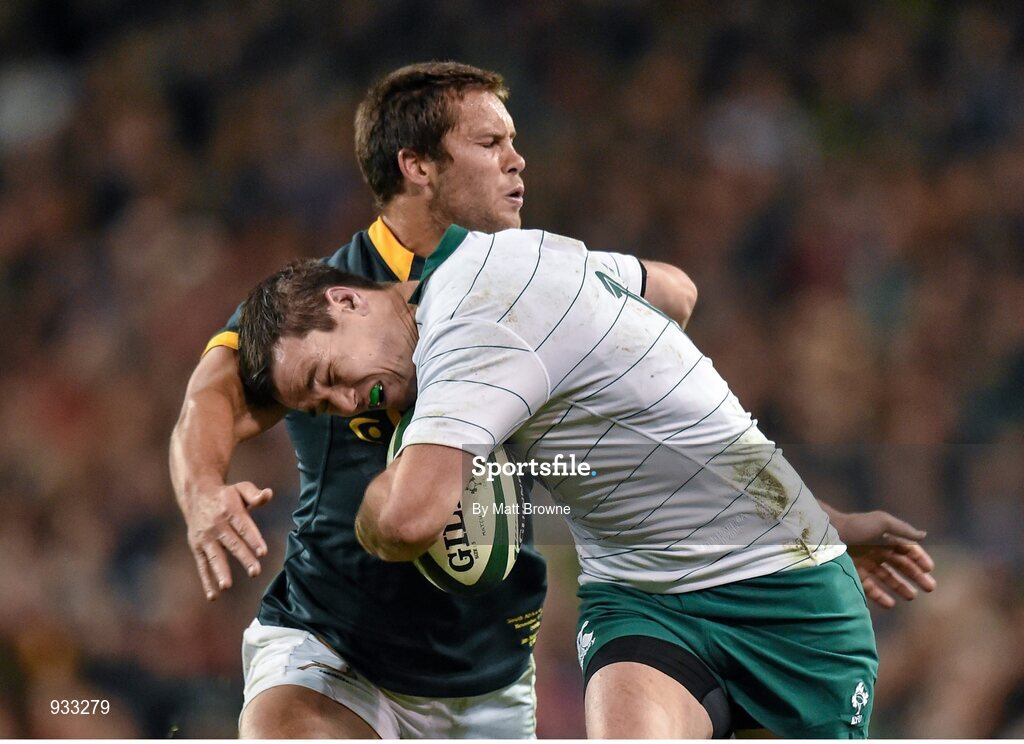 8 November 2014; Jonathan Sexton, Ireland, is tackled by Jan Serfontein, South Africa. Guinness Series, Ireland v South Africa, Aviva Stadium, Lansdowne Road, Dublin. Picture credit: Matt Browne / SPORTSFILE