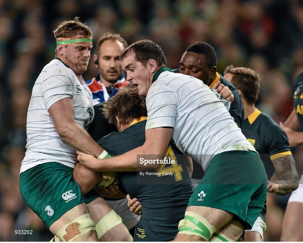 8 November 2014; Eben Etzebeth, South Africa, is tackled by Jamie Heaslip, left, and Devin Toner, Ireland. Guinness Series, Ireland v South Africa, Aviva Stadium, Lansdowne Road, Dublin. Picture credit: Ramsey Cardy / SPORTSFILE
