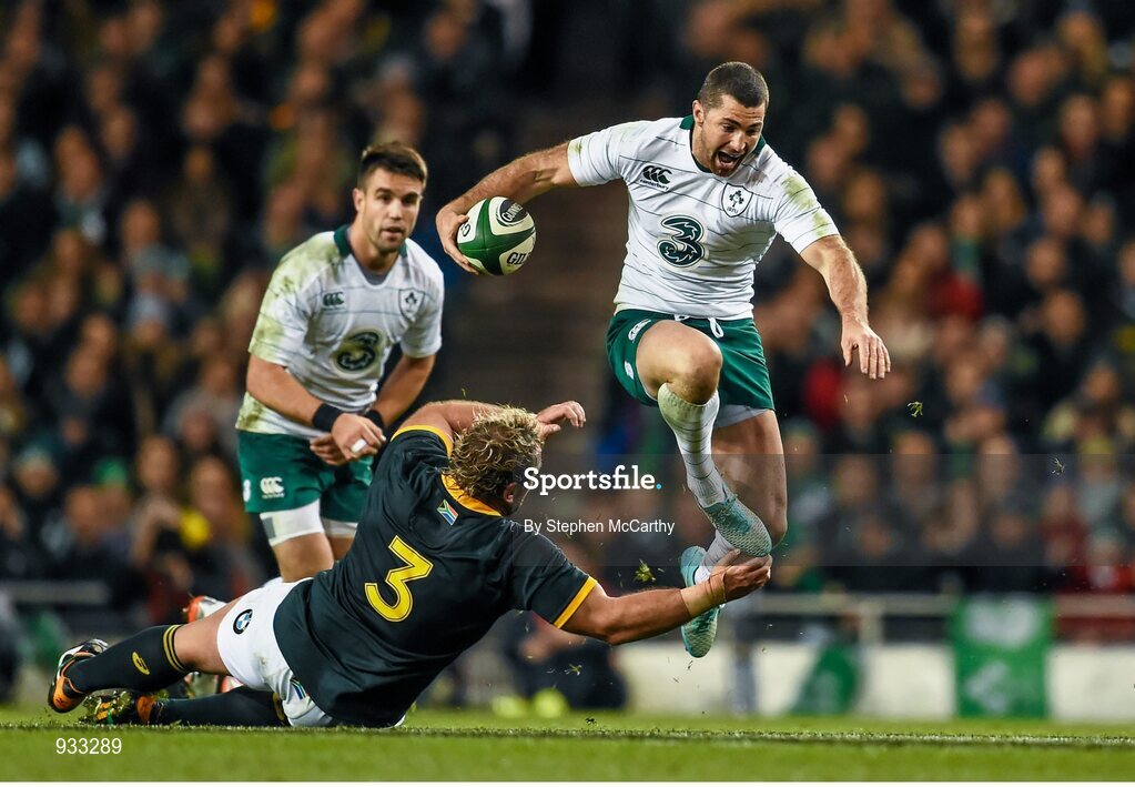 8 November 2014; Rob Kearney, Ireland, evades the tackle of Jannie du Plessis, South Africa. Guinness Series, Ireland v South Africa, Aviva Stadium, Lansdowne Road, Dublin. Picture credit: Stephen McCarthy / SPORTSFILE