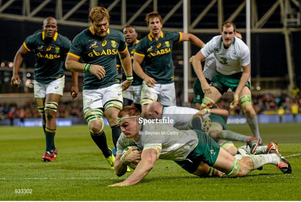 8 November 2014; Rhys Ruddock, Ireland, dives in to score his side's first try of the game. Guinness Series, Ireland v South Africa, Aviva Stadium, Lansdowne Road, Dublin. Picture credit: Stephen McCarthy / SPORTSFILE