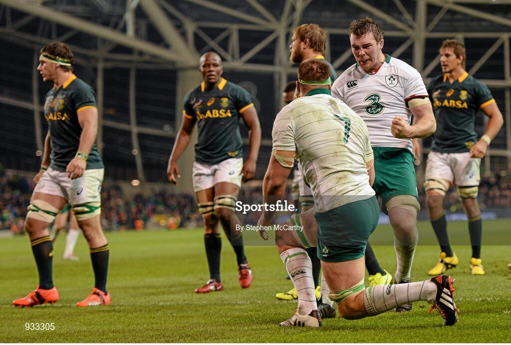 8 November 2014; Rhys Ruddock, Ireland, is congratulated by teammate Peter O'Mahony after scoring their side's first try of the game. Guinness Series, Ireland v South Africa, Aviva Stadium, Lansdowne Road, Dublin. Picture credit: Stephen McCarthy / SPORTSFILE