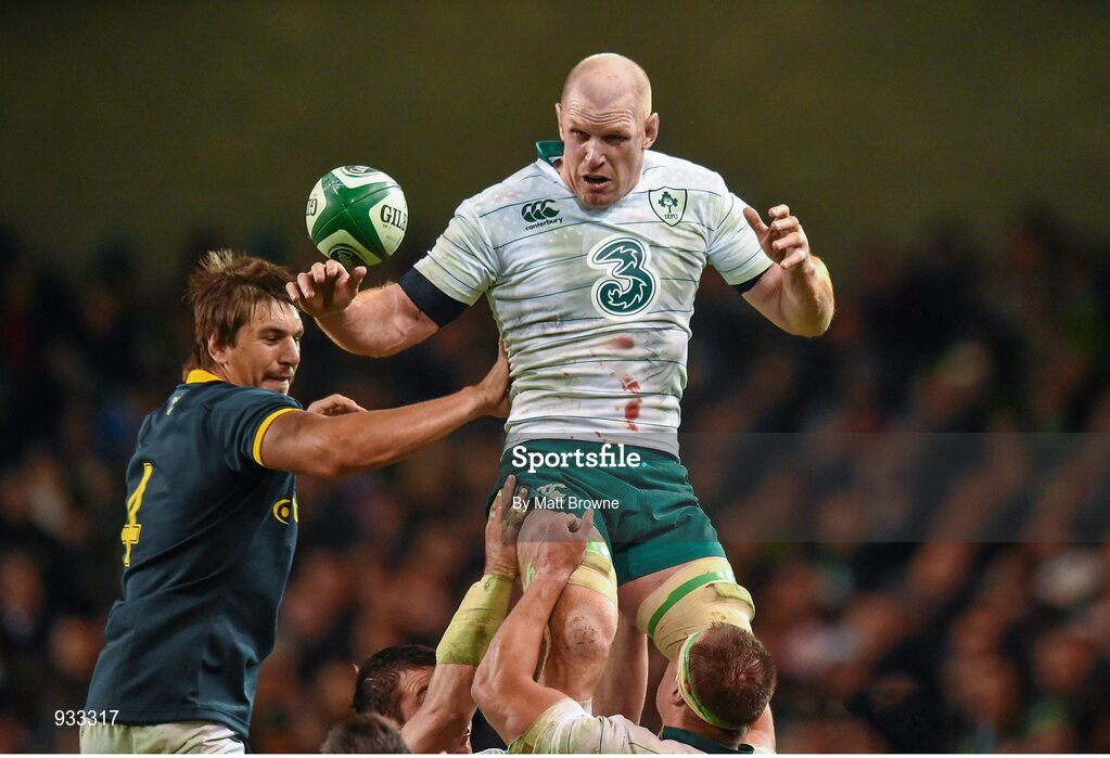 8 November 2014; Paul O'Connell, Ireland, takes the ball in the lineout ahead of Eben Etzebeth, South Africa. Guinness Series, Ireland v South Africa, Aviva Stadium, Lansdowne Road, Dublin. Picture credit: Matt Browne / SPORTSFILE