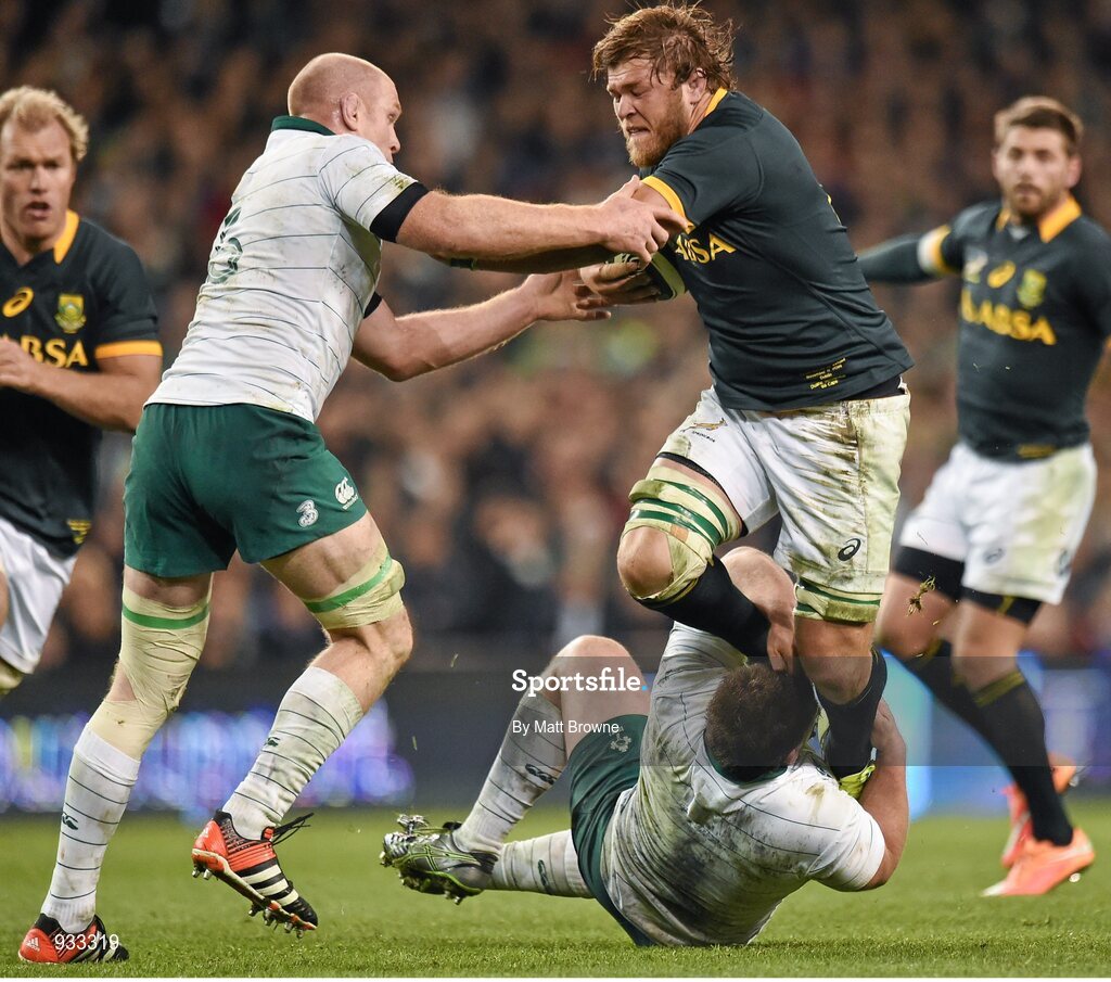 8 November 2014; Duane Vermeulen, South Africa, is tackled by Jack McGrath, ground, and Paul O'Connell, Ireland. Guinness Series, Ireland v South Africa, Aviva Stadium, Lansdowne Road, Dublin. Picture credit: Matt Browne / SPORTSFILE