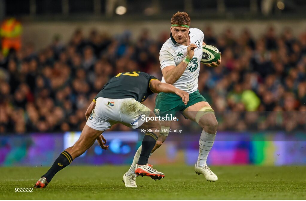 8 November 2014; Jamie Heaslip, Ireland, is tackled by Jan Serfontein, South Africa. Guinness Series, Ireland v South Africa, Aviva Stadium, Lansdowne Road, Dublin. Picture credit: Stephen McCarthy / SPORTSFILE