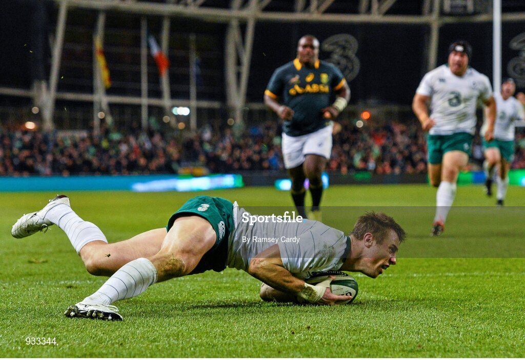 8 November 2014; Tommy Bowe, Ireland, scores his side's second try of the game. Guinness Series, Ireland v South Africa, Aviva Stadium, Lansdowne Road, Dublin. Picture credit: Ramsey Cardy / SPORTSFILE