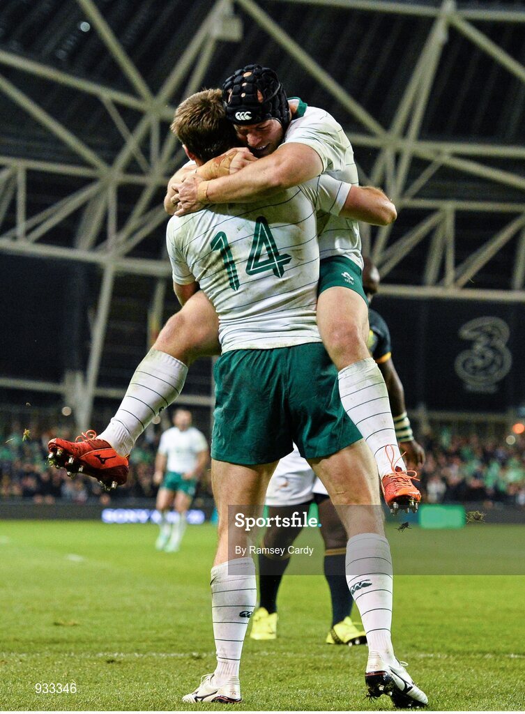 8 November 2014; Ireland's Tommy Bowe is congratulated by team-mate Richardt Strauss after scoring his side's second try. Guinness Series, Ireland v South Africa, Aviva Stadium, Lansdowne Road, Dublin. Picture credit: Ramsey Cardy / SPORTSFILE