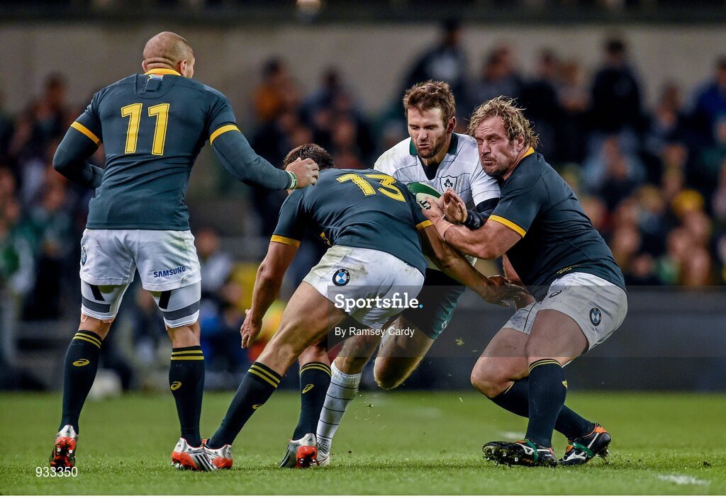 8 November 2014; Jared Payne, Ireland, is tackled by Jan Serfontein, left, and Jannie du Plessis, South Africa, as Bryan Habana looks on. Guinness Series, Ireland v South Africa, Aviva Stadium, Lansdowne Road, Dublin. Picture credit: Ramsey Cardy / SPORTSFILE