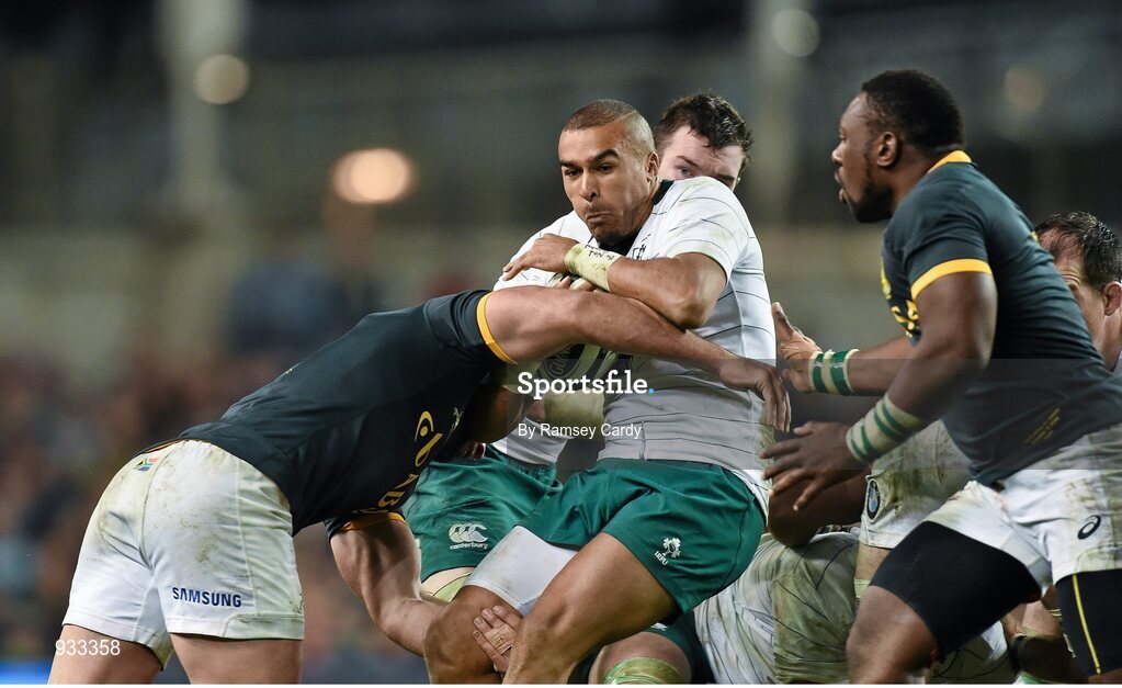 8 November 2014; Simon Zebo, Ireland, is tackled by Bismarck du Plessis, South Africa. Guinness Series, Ireland v South Africa, Aviva Stadium, Lansdowne Road, Dublin. Picture credit: Ramsey Cardy / SPORTSFILE