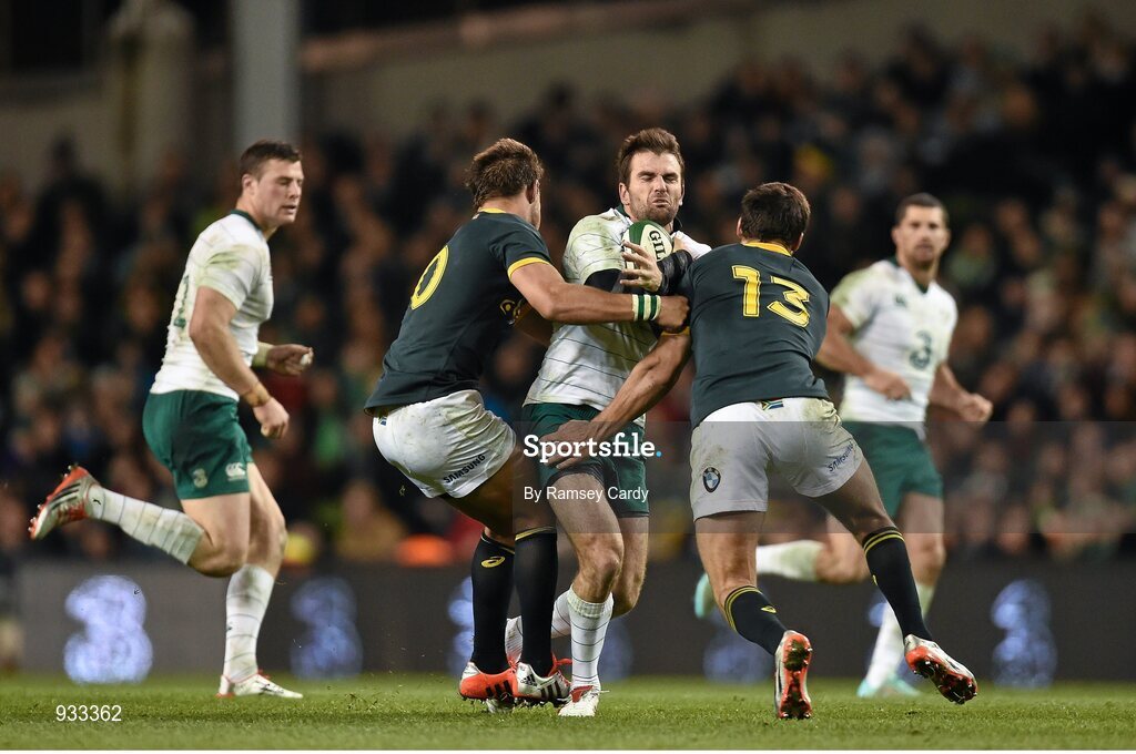 8 November 2014; Jared Payne, Ireland, is tackled by Handré Pollard, left, and Jan Serfontein, South Africa. Guinness Series, Ireland v South Africa, Aviva Stadium, Lansdowne Road, Dublin. Picture credit: Ramsey Cardy / SPORTSFILE