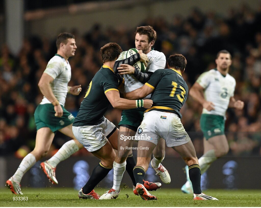 8 November 2014; Jared Payne, Ireland, is tackled by Handré Pollard, left, and Jan Serfontein, South Africa. Guinness Series, Ireland v South Africa, Aviva Stadium, Lansdowne Road, Dublin. Picture credit: Ramsey Cardy / SPORTSFILE