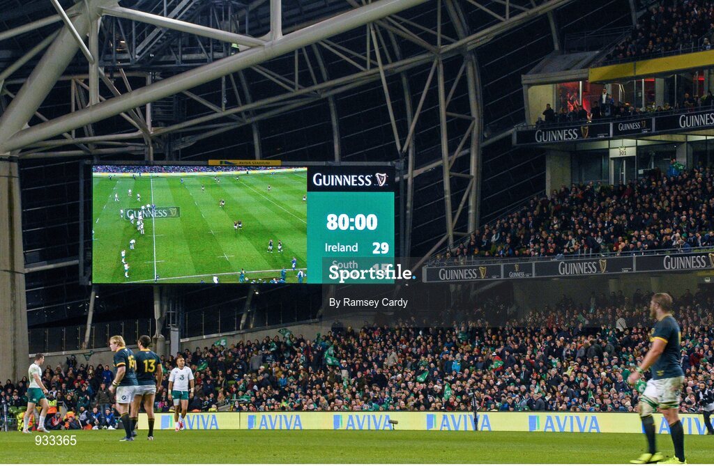 8 November 2014; The scoreboard in the stadium after the final whistle. Guinness Series, Ireland v South Africa, Aviva Stadium, Lansdowne Road, Dublin. Picture credit: Ramsey Cardy / SPORTSFILE