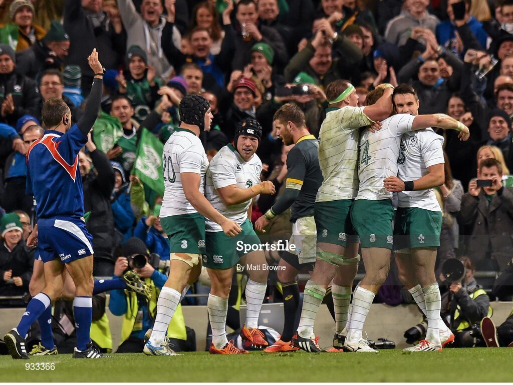 8 November 2014; Tommy Bowe, Ireland, is congratulated by teammates Rhys Ruddock, left, and Conor Murray after scoring their side's second try of the game. Guinness Series, Ireland v South Africa, Aviva Stadium, Lansdowne Road, Dublin. Picture credit: Matt Browne / SPORTSFILE