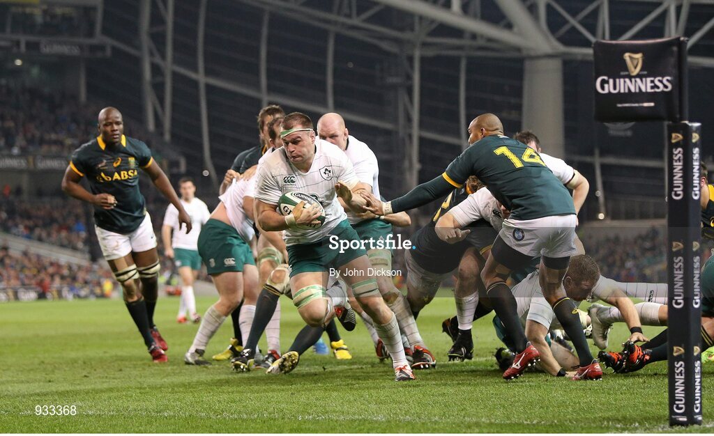 8 November 2014; Rhys Ruddock, Ireland, breaks through to score his side's first try of the game. Guinness Series, Ireland v South Africa, Aviva Stadium, Lansdowne Road, Dublin. Picture credit: John Dickson / SPORTSFILE