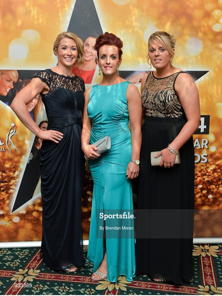 8 November 2014; In attendance at the TG4 Ladies Football All-Star Awards are, from left, Down footballers Eliza Downey, Aileen Pyers, and Kyla Trainor. TG4 Ladies Football All-Star Awards 2014, Citywest Hotel, Saggart, Co. Dublin. Picture credit: Brendan Moran / SPORTSFILE
