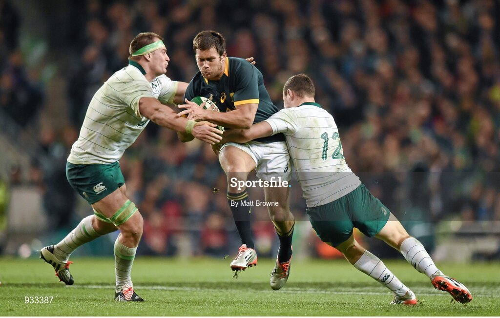 8 November 2014; Jan Serfontein, South Africa, is tackled by Rhys Ruddock, left, and Robbie Henshaw, Ireland. Guinness Series, Ireland v South Africa, Aviva Stadium, Lansdowne Road, Dublin. Picture credit: Matt Browne / SPORTSFILE