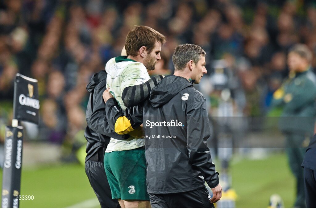 8 November 2014; Ireland's Jared Payne leaves the field injured. Guinness Series, Ireland v South Africa, Aviva Stadium, Lansdowne Road, Dublin. Picture credit: Matt Browne / SPORTSFILE