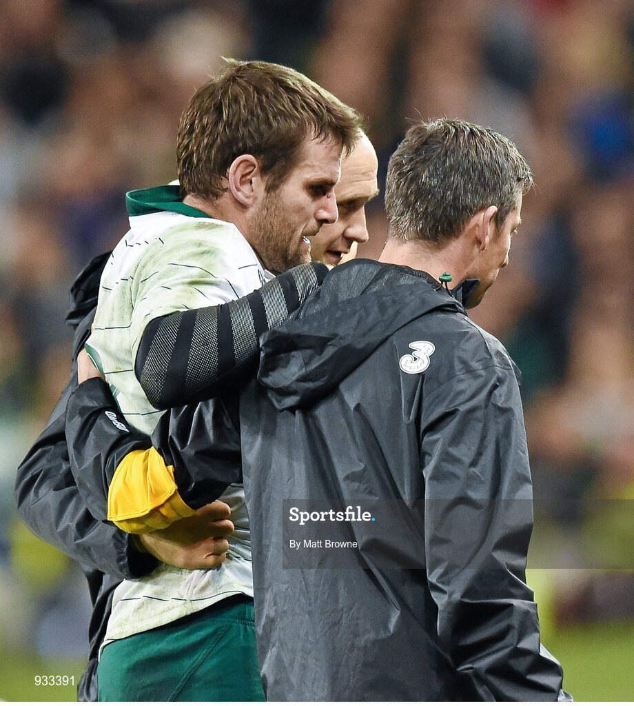 8 November 2014; Ireland's Jared Payne leaves the field injured. Guinness Series, Ireland v South Africa, Aviva Stadium, Lansdowne Road, Dublin. Picture credit: Matt Browne / SPORTSFILE