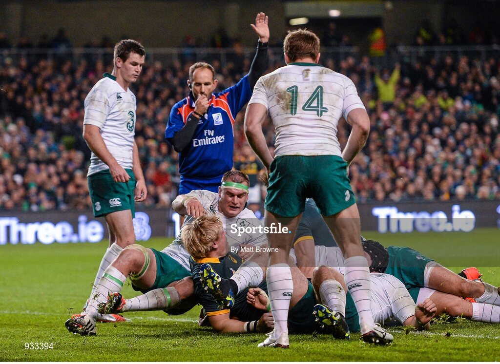 8 November 2014; Marcell Coetzee, South Africa, drives over the line to score his side's first try of the game. Guinness Series, Ireland v South Africa, Aviva Stadium, Lansdowne Road, Dublin. Picture credit: Matt Browne / SPORTSFILE