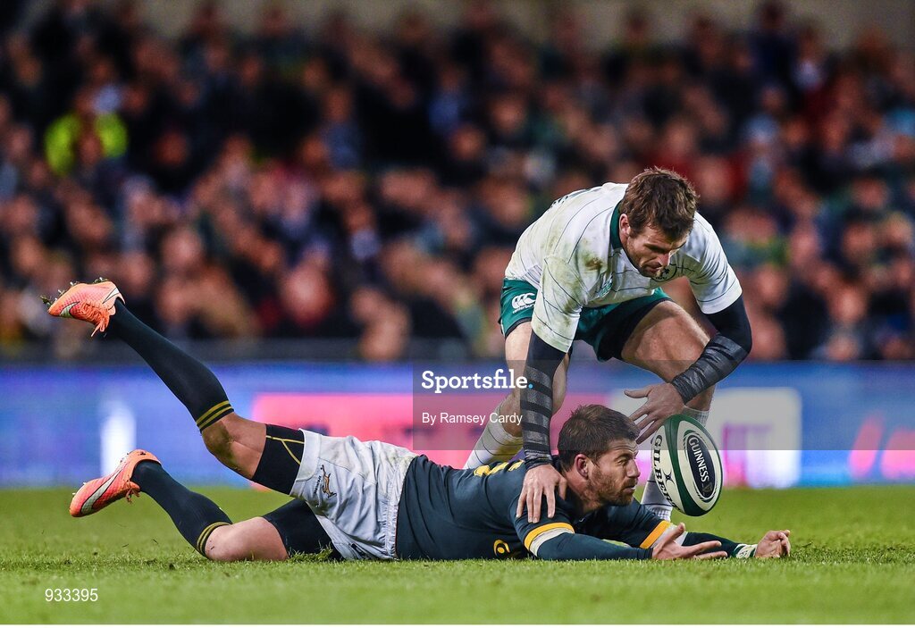 8 November 2014; Jared Payne, Ireland, dispossesses Willie le Roux, South Africa. Guinness Series, Ireland v South Africa, Aviva Stadium, Lansdowne Road, Dublin. Picture credit: Ramsey Cardy / SPORTSFILE