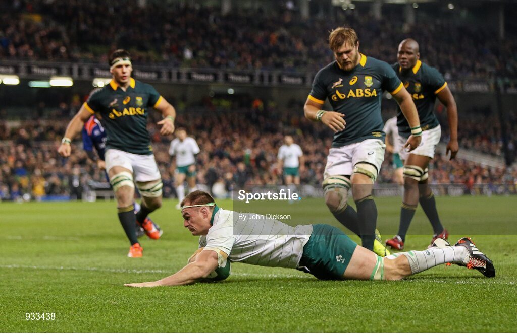 8 November 2014; Rhys Ruddock, Ireland, dives in to score his side's first try of the game. Guinness Series, Ireland v South Africa, Aviva Stadium, Lansdowne Road, Dublin. Picture credit: John Dickson / SPORTSFILE