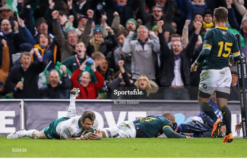 8 November 2014; Tommy Bowe, Ireland, scores his side's second try of the game despite the tackle of Bryan Habana, South Africa. Guinness Series, Ireland v South Africa, Aviva Stadium, Lansdowne Road, Dublin. Picture credit: John Dickson / SPORTSFILE