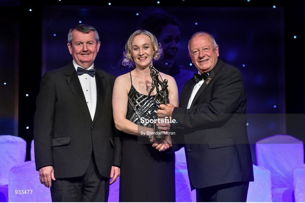 8 November 2014; Mary Rose kelly, Wexford, is presented with her TG4 Ladies Football Junior Players' Player of the Year Award by Pat Quill, President of the Ladies Gaelic Football Association, in the company of Pól O Gallchóir, left, Ceannsaí, TG4. TG4 Ladies Football All-Star Awards 2014, Citywest Hotel, Saggart, Co. Dublin. Picture credit: Brendan Moran / SPORTSFILE