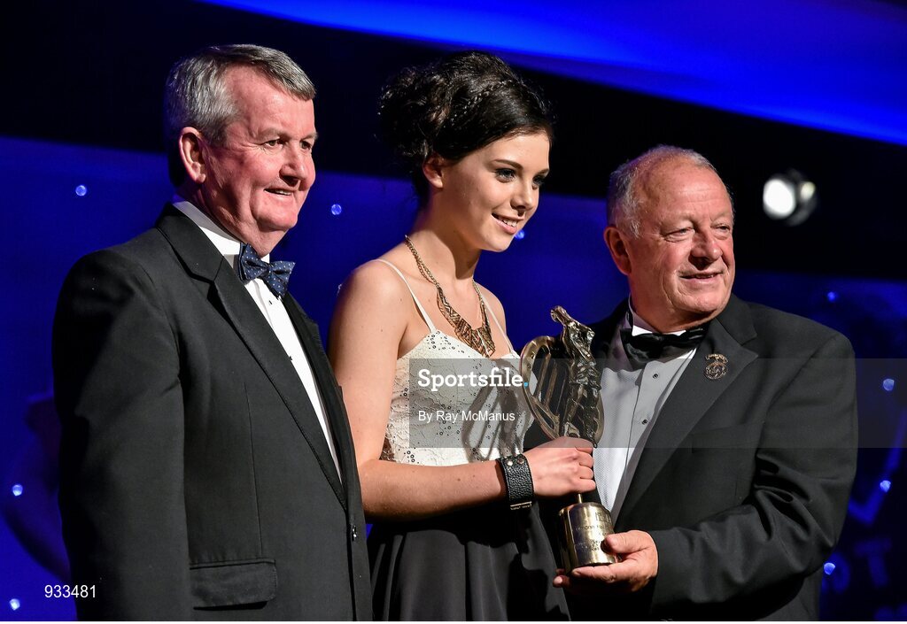 8 November 2014; Rebecca Waldron, Mayo, is presented with her TG4 Ladies Football Connacht Young Player of the Year Award by Pat Quill, President of the Ladies Gaelic Football Association, in the company of Pól O Gallchóir, left, Ceannsaí, TG4. TG4 Ladies Football All-Star Awards 2014, Citywest Hotel, Saggart, Co. Dublin. Picture credit: Ray McManus / SPORTSFILE
