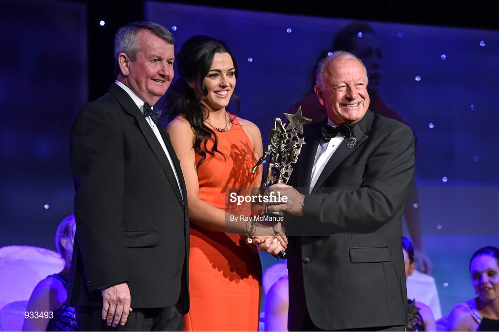 8 November 2014; Sinead Goldrick, Dublin, is presented with her TG4 Ladies Football All-Star Award by Pat Quill, President of the Ladies Gaelic Football Association, in the company of Pól O Gallchóir, left, Ceannsaí, TG4. TG4 Ladies Football All-Star Awards 2014, Citywest Hotel, Saggart, Co. Dublin. Picture credit: Ray McManus / SPORTSFILE