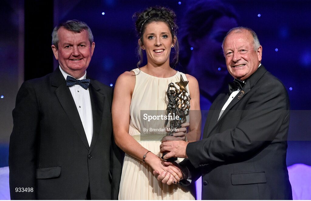8 November 2014; Ciara O'Sullivan, Cork, is presented with her TG4 Ladies Football All-Star Award by Pat Quill, President of the Ladies Gaelic Football Association, in the company of Pól O Gallchóir, left, Ceannsaí, TG4. TG4 Ladies Football All-Star Awards 2014, Citywest Hotel, Saggart, Co. Dublin. Picture credit: Brendan Moran / SPORTSFILE