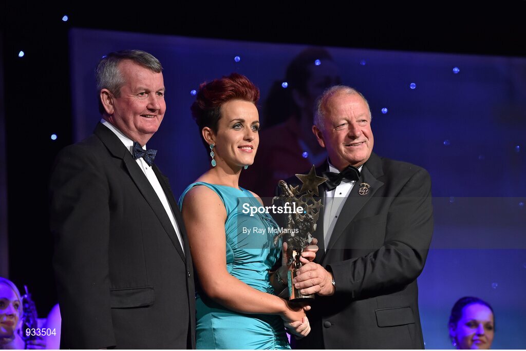 8 November 2014; Aileen Pyers, Down, is presented with her TG4 Ladies Football All-Star Award by Pat Quill, President of the Ladies Gaelic Football Association, in the company of Pól O Gallchóir, left, Ceannsaí, TG4. TG4 Ladies Football All-Star Awards 2014, Citywest Hotel, Saggart, Co. Dublin. Picture credit: Ray McManus / SPORTSFILE