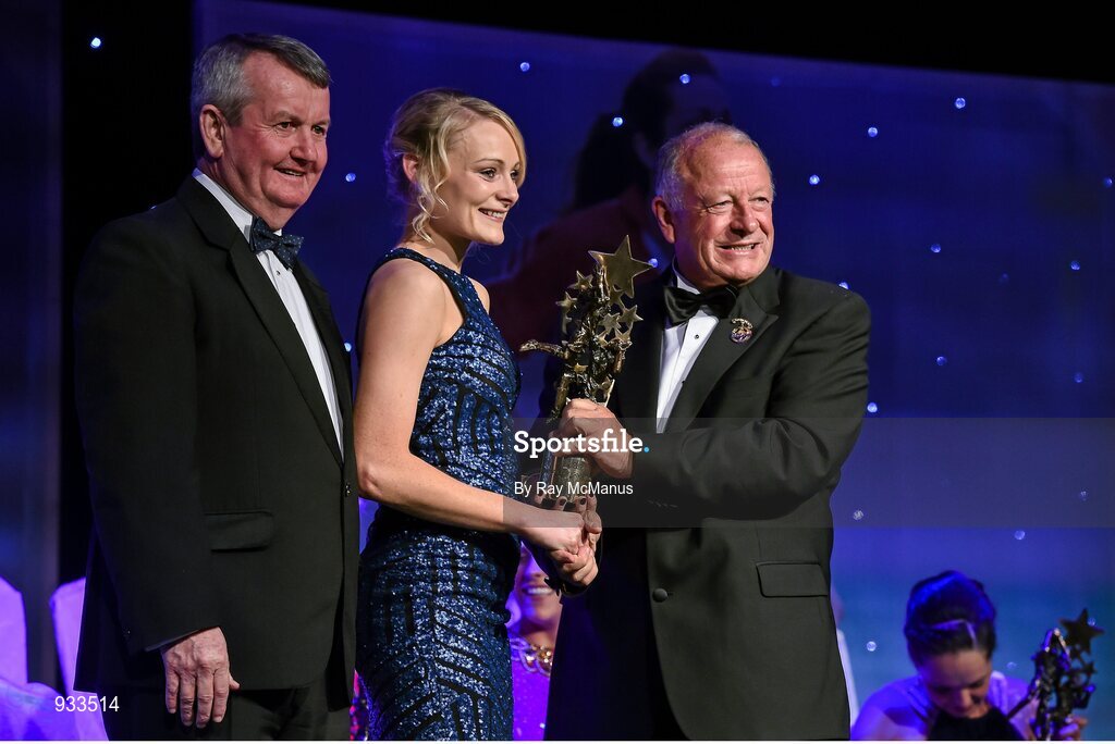 8 November 2014; Vera Foley, Cork, is presented with her TG4 Ladies Football All-Star Award by Pat Quill, President of the Ladies Gaelic Football Association, in the company of Pól O Gallchóir, left, Ceannsaí, TG4. TG4 Ladies Football All-Star Awards 2014, Citywest Hotel, Saggart, Co. Dublin. Picture credit: Ray McManus / SPORTSFILE