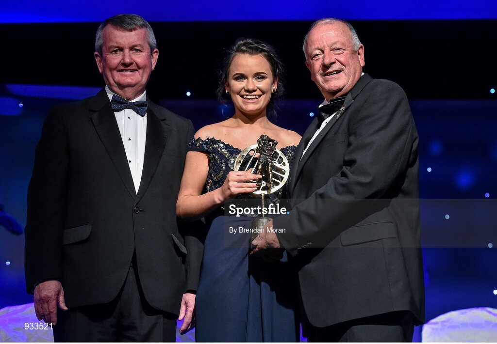 8 November 2014; Geraldine Smith, Cavan, is presented with her TG4 Ladies Football Ulster Young Player of the Year Award by Pat Quill, President of the Ladies Gaelic Football Association, in the company of Pól O Gallchóir, left, Ceannsaí, TG4. TG4 Ladies Football All-Star Awards 2014, Citywest Hotel, Saggart, Co. Dublin. Picture credit: Brendan Moran / SPORTSFILE