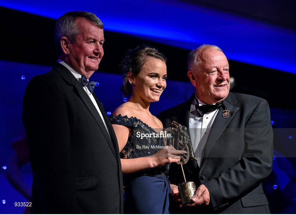 8 November 2014; Geraldine Smith, Cavan, is presented with her TG4 Ladies Football Ulster Young Player of the Year Award by Pat Quill, President of the Ladies Gaelic Football Association, in the company of Pól O Gallchóir, left, Ceannsaí, TG4. TG4 Ladies Football All-Star Awards 2014, Citywest Hotel, Saggart, Co. Dublin. Picture credit: Ray McManus / SPORTSFILE